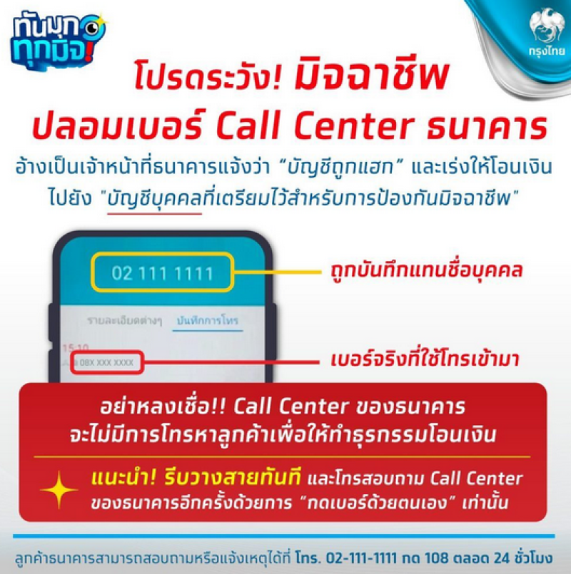 อย่าหลงเชื่อ Call Center ของธนาคาร จะไม่มีการโทรหาลูกค้าเพื่อให้ทำธุรกรรมโอนเงิน แนะนำ! รีบวางสายทันที และโทรสอบถาม Call Center ของธนาคารอีกครั้งด้วยการ กดเบอร์ด้วยตนเอง เท่านั้น