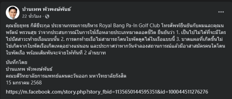 กลับมารื้อฟื้นคดีอีกครั้งสำหรับสาเหตุการเสียชีวิตของนักแสดงสาว แตงโม นิดา โดยจะมีการจัดรจำลองเหตุการณ์การตกเรือของ แตงโม ในวันที่ 16 ม.ค. 68 นี้ แต่กลับกลายเป็นประเด็นร้อนเเรงเมื่อ คุณชัยยุทธ กิติธีระกุล ไฮโซนักธุรกิจชื่อดัง และประธานกรรมการบริหาร Royal Bang Pa-In Golf Club ออกมาโพสต์ประกาศอย่างมั่นใจว่า