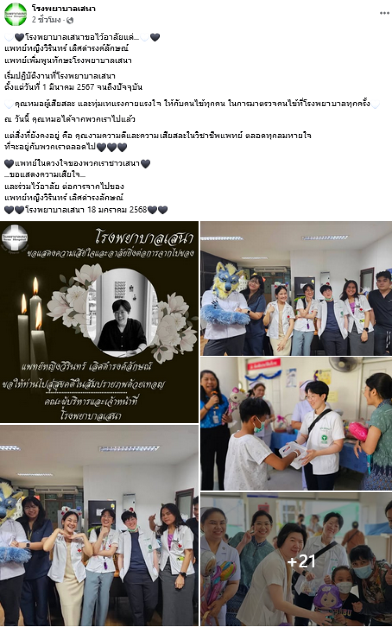แพทย์ในดวงใจของพวกเราชาวเสนา ขอแสดงความเสียใจ และร่วมไว้อาลัย ต่อการจากไปของ แพทย์หญิงวิรินทร์ เลิศดำรงค์ลักษณ์