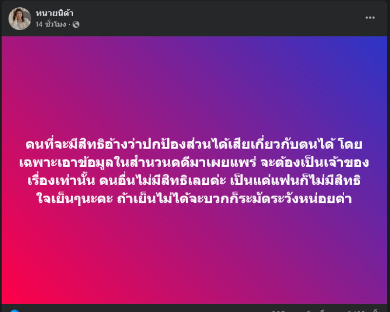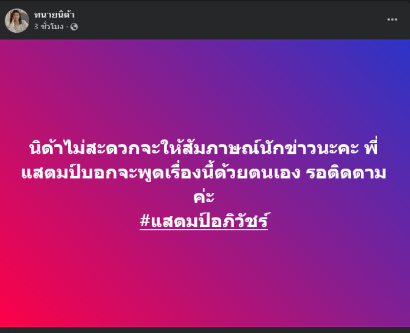 ล่าสุดทางด้านทนายนิด้า ซึ่งเป็นทนายของ แสตมป์ ได้ออกมาโพสต์ข้อความผ่านทางเฟซบุ๊ค ทนายนิด้า ว่า เรื่องฟ้องร้องคดีอะไรกัน นิด้าไม่สามารถพูดได้ถ้าลูกความไม่ได้อนุญาต แต่เรื่องข่มขู่เป็นเรื่องจริง คดีจบแต่คนไม่จบเป็นเรื่องจริง เรื่องพ่อใช้ยศในทางไม่เหมาะสมคือเรื่องจริง ต่อมาได้โพสต์อีกว่า นิด้าไม่สะดวกจะให้สัมภาษณ์นักข่าวนะคะ พี่แสตมป์บอกจะพูดเรื่องนี้ด้วยตนเอง รอติดตามค่ะ