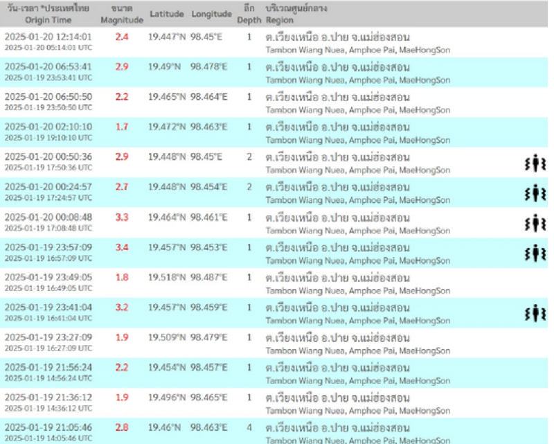 กองเฝ้าระวังแผ่นดินไหว กรมอุตุนิยมวิทยา รายงานว่าตั้งแต่เวลา 21.05 น. วันที่ 19 ธ.ค. 2568 (ตามเวลาในประเทศไทย) จนถึง เวลา 12.14 น. 20 ธ.ค. 2568 เกิดแผ่นดินไหวแล้ว 14 ครั้ง ในพื้นที่ ต.เวียงเหนือ อ.ปาย จ.แม่ฮ่องสอน แรงสุดขนาด 3.4 ความลึก 1 กิโลเมตร ทั้งนี้ กองเฝ้าระวังแผ่นดินไหว ระบุว่า สาเหตุเกิดจากกลุ่มรอยเลื่อนเวียงแหง