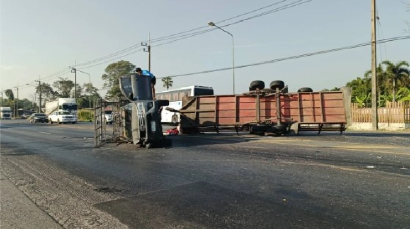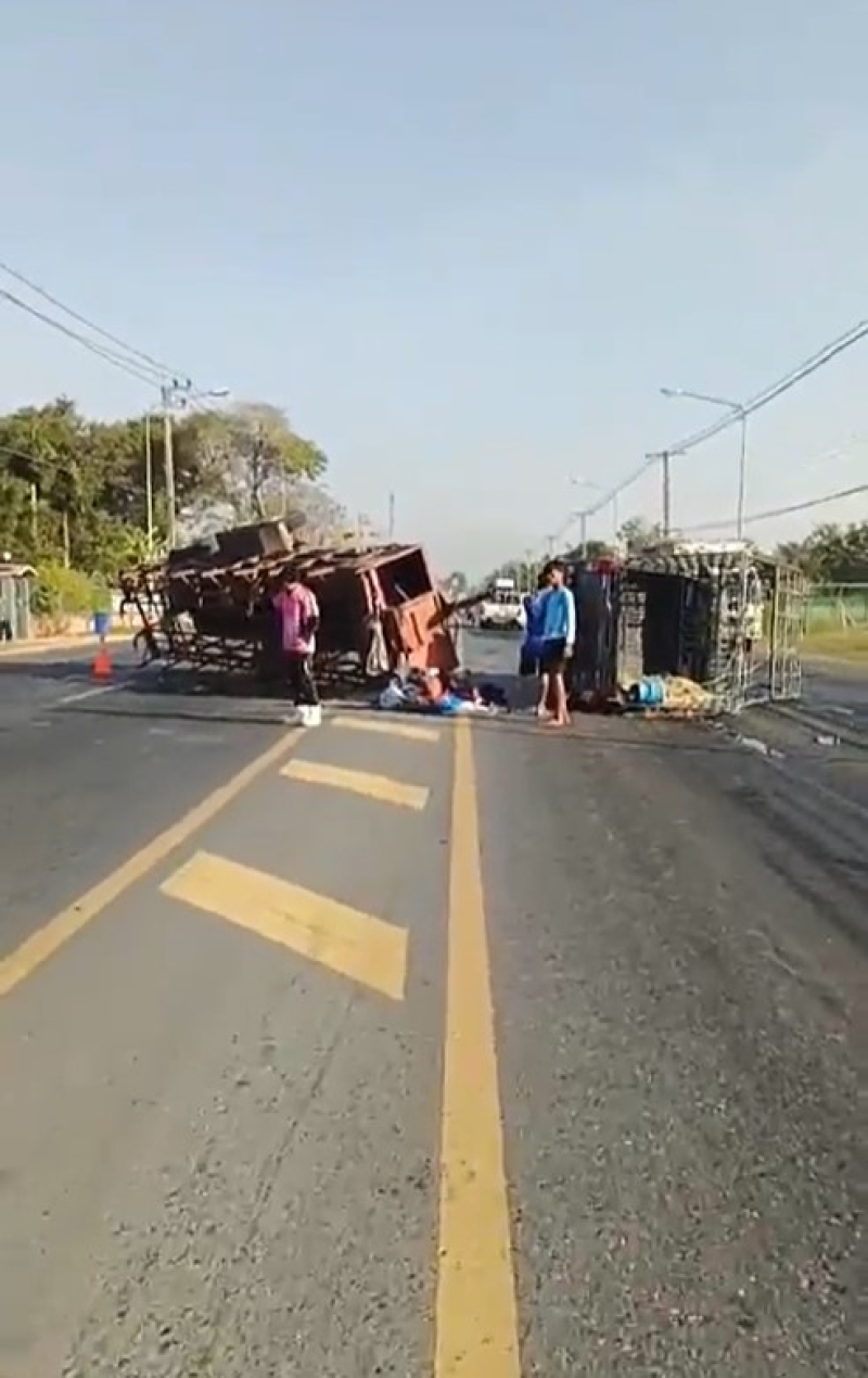 สอบถามนายไพรัช ประกอบผล หรือ พัด อายุ 24 ปี ที่มากับรถกระบะ บอกว่า ลูกพี่ขับรถมาจาก อ.ปากช่อง มุ่งหน้าบ้านนา จะไปบรรทุกฟางก้อนที่ อ.บางน้ำเปรี้ยว จ.ฉะเชิงเทรา ตนนอนหลับอยู่ในตู้เก็บของท้ายพ่วง มารู้สึกตัวตอนพ่วงพลิกตะแคง จึงเปิดประตูคลานออกมา โดยได้รับบาดเจ็บที่ขาเล็กน้อย เชื่อบารมีเล็กไหล ที่พกอยู่ ทำให้แคล้วคลาดปลอดภัย