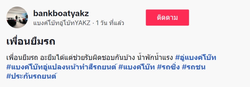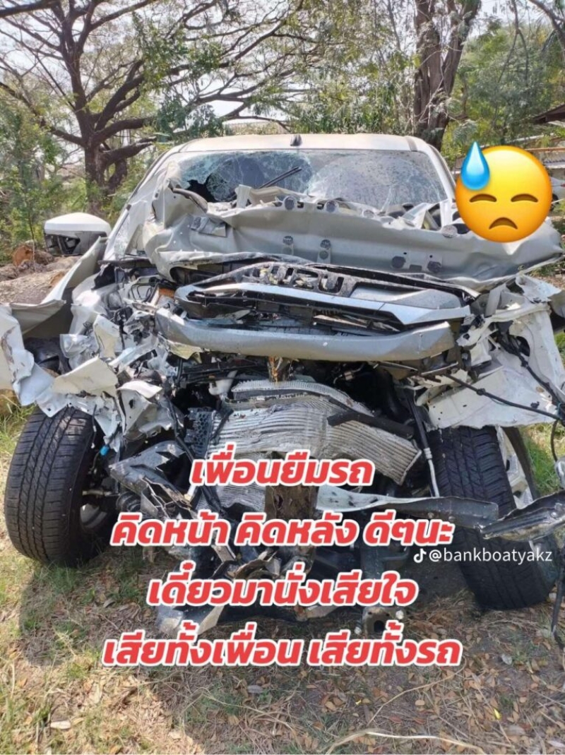 จากกรณี ผู้ใช้ TikTok @bankboatyakz ได้โพสต์วิดีโอคลิปภาพรถยนต์ที่สภาพพังยับจากการเกิดอุบัติเหตุ หลังจากที่เพื่อนยืมรถยนต์ไปขับ หลังจากที่เกิดเหตุเพื่อนก็หนีหายไม่รับผิดชอบเลย เตือนเป็นอุทาหรณ์รักเพื่อนอย่าให้เพื่อนยืมรถ โดยได้โพสต์ระบุว่า เพื่อนยืมรถ อะยืมได้แต่ช่วยรับผิดชอบกันบ้าง น้ำพักน้ำแรง