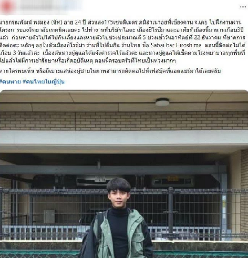 จากกรณีญาติโพสต์ตามหา นายกรณพัฒน์ พรมฮุ่ง หรือ นัท ชาว อ.เชียงคาน จ.เลย จบการศึกษาวิทยาลัยเทคนิคเลย ระดับ ปวส. และได้ร่วมโครงการนักศึกษาฝึกงานที่จังหวัดฮิโรชิม่า ประเทศญี่ปุ่น มีสัญญา 3 ปี เดินทางถึงประเทศญี่ปุ่น เมื่อวันที่ 22 เม.ย. 2565 และมีกำหนดกลับประเทศไทยวันที่ 22 เม.ย. 2568 แต่หายตัวไปช่วงประมาณ 05.00 น. วันที่ 22 ธ.ค. 2567 ระหว่างไปกินเลี้ยงกับเพื่อน ที่ร้านอาหารไทย ในฮิโรชิม่า