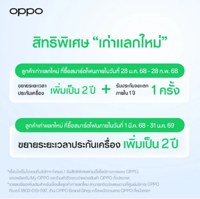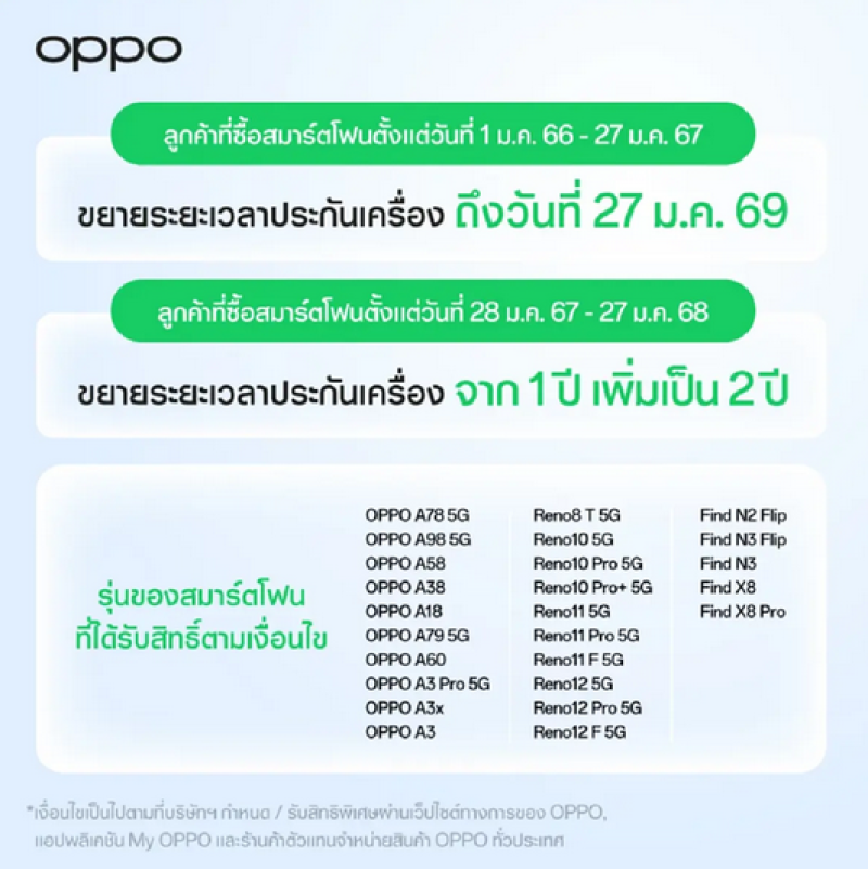 สำหรับลูกค้าที่ซื้อสมาร์ตโฟน "OPPO" ตั้งแต่วันที่ 1 มกราคม 2566 ถึง 27 มกราคม 2568 จะได้รับการขยายระยะเวลาการรับประกันเครื่องให้อีก โดยแบ่งเป็น 2 กรณี ดังนี้