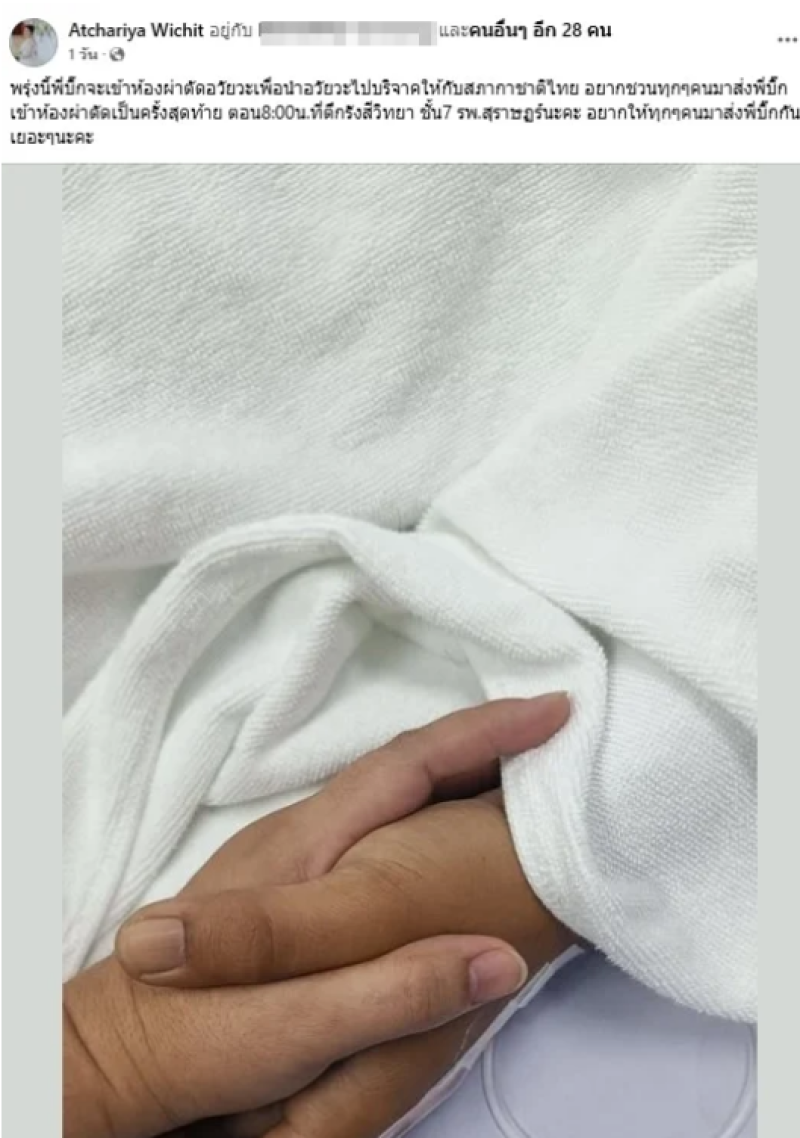 พรุ่งนี้พี่บิ๊กจะเข้าห้องผ่าตัดอวัยวะเพื่อนำอวัยวะไปบริจาคให้กับสภากาชาติไทย อยากชวนทุก ๆ คนมาส่งพี่บิ๊กเข้าห้องผ่าตัดเป็นครั้งสุดท้าย ตอน 8:00 น. ที่ตึกรังสีวิทยา ชั้น 7 รพ.สุราษฏร์นะคะ อยากให้ทุกๆคนมาส่งพี่บิ๊กกันเยอะ ๆ นะคะ”