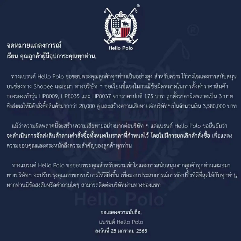 จากกรณี เพจเฟซบุ๊ก Hello Polo ได้ออกมาโพสต์ข้อความชี้แจง ปม Hello Polo ได้ ตั้งราคารองเท้าผิด จาก 175 เหลือ 3 บาท ระบุดังนี้