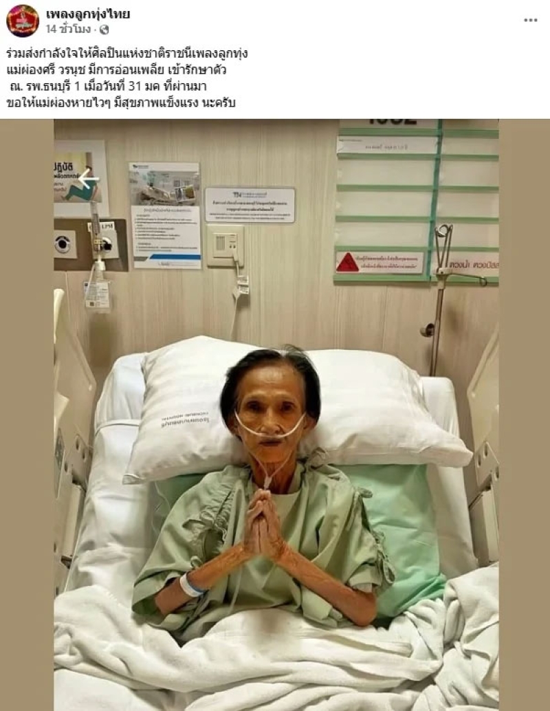 วันที่ 2 กุมภาพันธ์ 2568 ทางเพจเฟซบุ๊ก เพลงลูกทุ่งไทย ได้ออกมาโพสต์ภาพของ แม่ผ่องศรี วรนุช ศิลปินแห่งชาติ และราชินีเพลงลูกทุ่ง นอนพักอยู่บนเตียงคนไข้ พร้อมสายออกซิเจน ทั้งนี้เพจดังได้ระบุข้อความแจ้งข่าวว่า