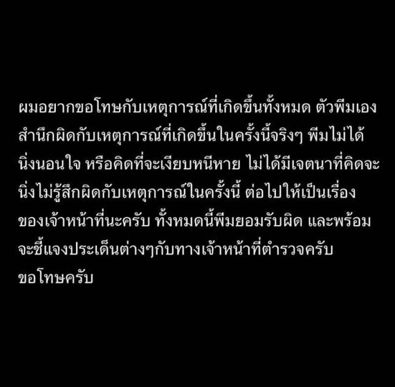 ทั้งนี้ด้าน รุ่นพี่ที่ก่อเหตุ ได้ออกมาโพสต์ข้อความ ระบุว่า ผมอยากขอโทษกับเหตุการณ์ที่เกิดขึ้นทั้งหมด ตัวพีมเองสำนึกผิดกับเหตุการณ์ที่เกิดขึ้นในครั้งนี้จริงๆ พีมไม่ได้นิ่งนอนใจ หรือคิดที่จะเงียบหาย ไม่ได้มีเจตนาที่คิดจะนิ่งไม่รู้สึกผิดกับเหตุการณ์ในครั้งนี้ ต่อไปให้เป็นเรื่องของเจ้าหน้าที่นะครับ ทั้งหมดนี้พีมยอมรับผิด และพร้อมจะชี้แจงประเด็นต่างๆกับทางเจ้าหน้าที่ตำรวจครับ ขอโทษครับ