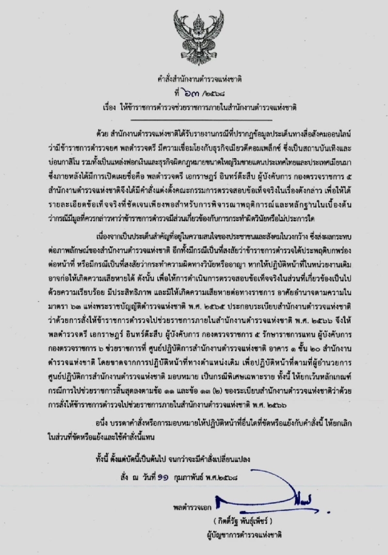 ดังนั้น เพื่อให้การตรวจสอบข้อเท็จจริงเป็นไปอย่างมีประสิทธิภาพและไม่ก่อให้เกิดความเสียหายต่อทางราชการ ผบ.ตร. จึงใช้อำนาจตามมาตรา 63 แห่งพระราชบัญญัติตำรวจแห่งชาติ พ.ศ. 2565 ให้ พล.ต.ต. เอกราษฎร์ ไปช่วยราชการที่ศูนย์ปฏิบัติการสำนักงานตำรวจแห่งชาติเป็นกรณีพิเศษ