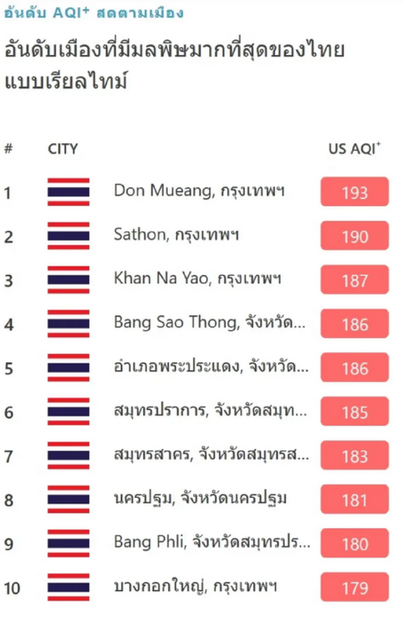 โดยเมื่อเวลา 10.57 น. วันที่ 12 ก.พ 2568 IQAir ได้มีการเปิดเผย 10 อันดับ เมืองที่มีมลพิษมากที่สุดของไทยแบบเรียลไทม์ ระดับสีแดง คือ มีผลกระทบต่อสุขภาพ ซึ่งมีดังนี้