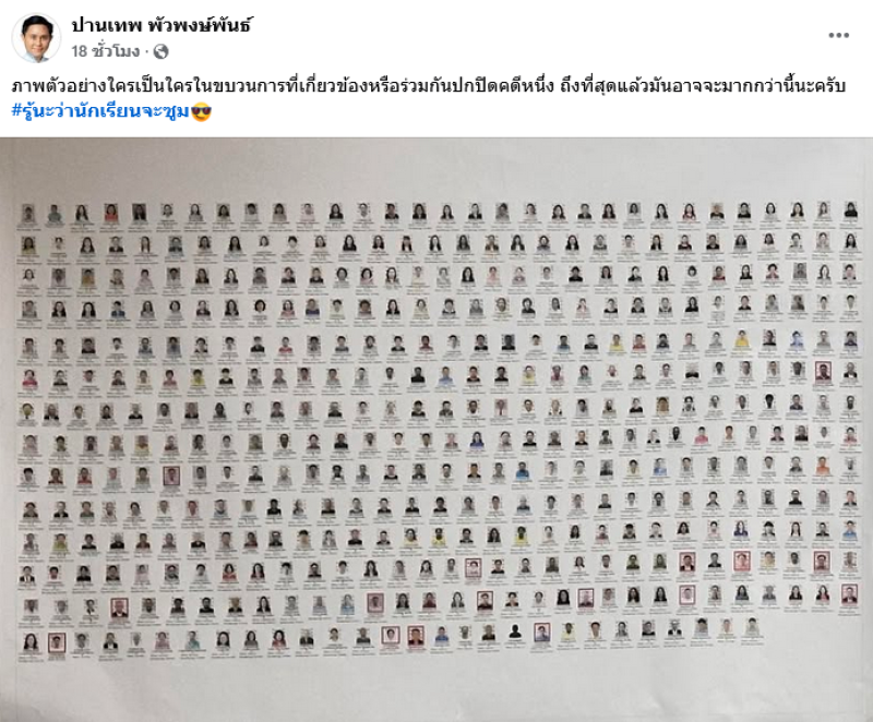 โดย อาจารย์ปานเทพ ได้โพสต์ภาพผ่านทางเฟซบุ๊ค ปานเทพ พัวพงษ์พันธ์ พร้อมเขียนแคปชั่นว่า ภาพตัวอย่างใครเป็นใครในขบวนการที่เกี่ยวข้องหรือร่วมกันปกปิดคดีหนึ่ง ถึงที่สุดแล้วมันอาจจะมากกว่านี้นะครับ #รู้นะว่านักเรียนจะซูม