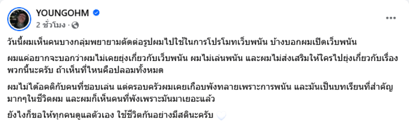 โดยระบุว่า วันนี้ผมเห็นคนบางกลุ่มพยายามตัดต่อรูปผมไปใช้ในการโปรโมตเว็บพนัน บ้างบอกผมเปิดเว็บพนัน ผมแค่อยากจะบอกว่าผมไม่เคยยุ่งเกี่ยวกับเว็บพนัน ผมไม่เล่นพนัน และผมไม่ส่งเสริมให้ใครไปยุ่งเกี่ยวกับเรื่องพวกนี้นะครับ