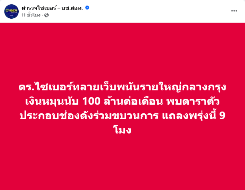 ล่าสุดทางด้านเพจเฟซบุ๊ค ตำรวจไซเบอร์ บช.สอท. ได้ออกมาโพสต์ข้อความว่า ตร.ไซเบอร์ทลายเว็บพนันรายใหญ่กลางกรุง เงินหมุนนับ 100 ล้านต่อเดือน พบดาราตัวประกอบช่องดังร่วมขบวนการ แถลงพรุ่งนี้ 9 โมง