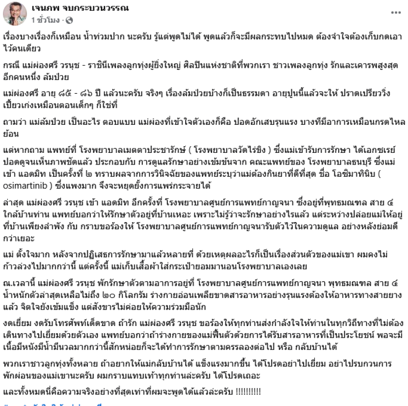 เรียกได้ว่าทำเอาแฟนๆต่างเป็นห่วงไม่น้อยสำหรับ แม่ผ่องศรี วรนุช ที่ล่าสุดทางด้าน เจนภพ ดีเจลูกทุ่งชื่อดัง ได้ออกมาเผยผ่านทางเฟซบุ๊คเจนภพ จบกระบวนวรรณ ว่า แม่ผ่องศรี วรนุช แอดมิทรพ.รอบ 2 น้ำหนักตัวเหลือไม่ถึง 20 กิโลกรัม ต้องให้อาหารทางสายยาง วอนทุกคนห้ามเยี่ยมเพื่อให้อาการดีขึ้น โดยระบุว่า