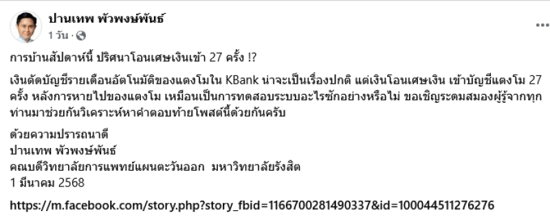 พร้อมเขียนข้อความว่า การบ้านสัปดาห์นี้ ปริศนาโอนเศษเงินเข้า 27 ครั้ง !? เงินตัดบัญชีรายเดือนอัตโนมัติของแตงโมใน KBank น่าจะเป็นเรื่องปกติ แต่เงินโอนเศษเงิน เข้าบัญชีแตงโม 27 ครั้ง หลังการหายไปของแตงโม เหมือนเป็นการทดสอบระบบอะไรซักอย่างหรือไม่ ขอเชิญระดมสมองผู้รู้จากทุกท่านมาช่วยกันวิเคราะห์หาคำตอบท้ายโพสต์นี้ด้วยกันครับ