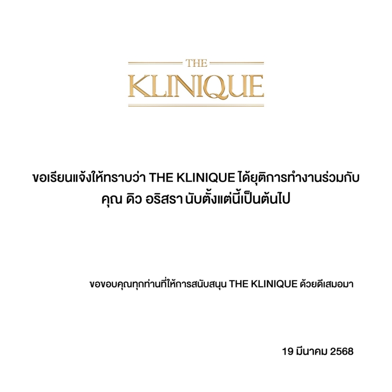 ล่าสุดทางด้านคลินิคความงามชื่อดังได้ออกมาประกาษเกี่ยวกับการทำงานร่วมกับ ดิว อริสรา ผ่านทางเพจเฟซบุ๊ค THE KLINIQUE โดยเเจ้งว่า ขอเรียนแจ้งให้ทราบ THE KLINIQUE ได้ยุติการร่วมงานกับ คุณ ดิว อริสรา นับตั้งแต่วันนี้ 19 มี.ค. 2568 เป็นต้นไป ขอบคุณค่ะ