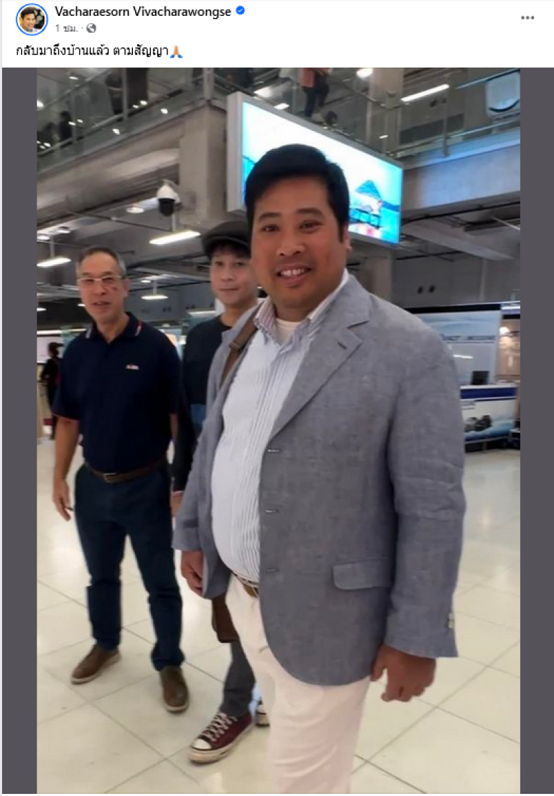 วันที่ 6 มี.ค.67 ท่านอ้น ได้โพสต์เฟซบุ๊ก Vacharaesorn Vivacharawongse เป็นภาพของท่านเดินอยู่ที่สนามบินสุวรรณภูมิ จ.สมุทรปราการ โดยระบุข้อความว่า กลับมาถึงบ้านแล้ว ตามสัญญา” พร้อมกับอิโมจิพนมมือไหว้ ซึ่งการเดินทางมาครั้งนี้ถือเป็นการเดินทางมาเยือนประเทศไทยเป็นการส่วนตัว