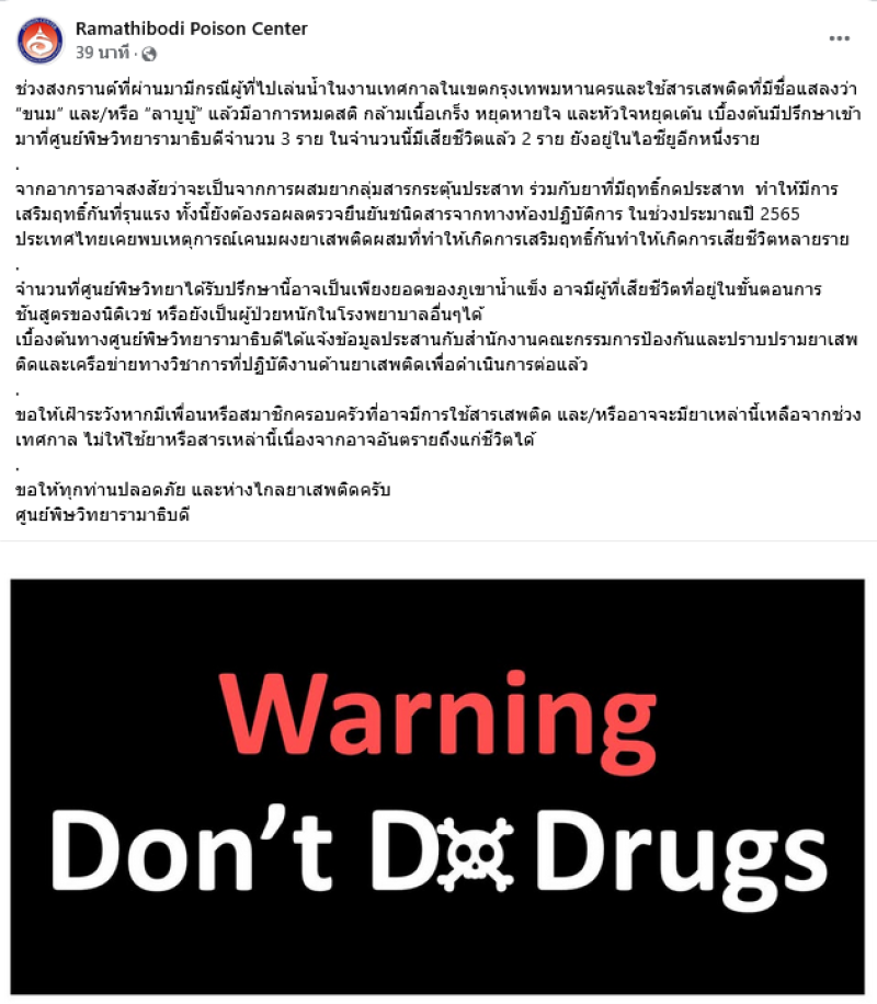 ศูนย์พิษวิทยารามาธิบดีออกประกาศเตือนภัย หลังพบผู้เสียชีวิตแล้ว 2 ราย และยังมีอีก 1 รายที่อยู่ในไอซียู จากกรณีมีผู้เล่นน้ำในงานสงกรานต์ในเขตกรุงเทพฯ ใช้สารเสพติดที่เรียกว่า “ขนม” และ/หรือ “ลาบูบู้” แล้วเกิดอาการหมดสติ กล้ามเนื้อเกร็ง หยุดหายใจ และหัวใจหยุดเต้น ต้องนำส่งเข้ารับการรักษาอย่างเร่งด่วน