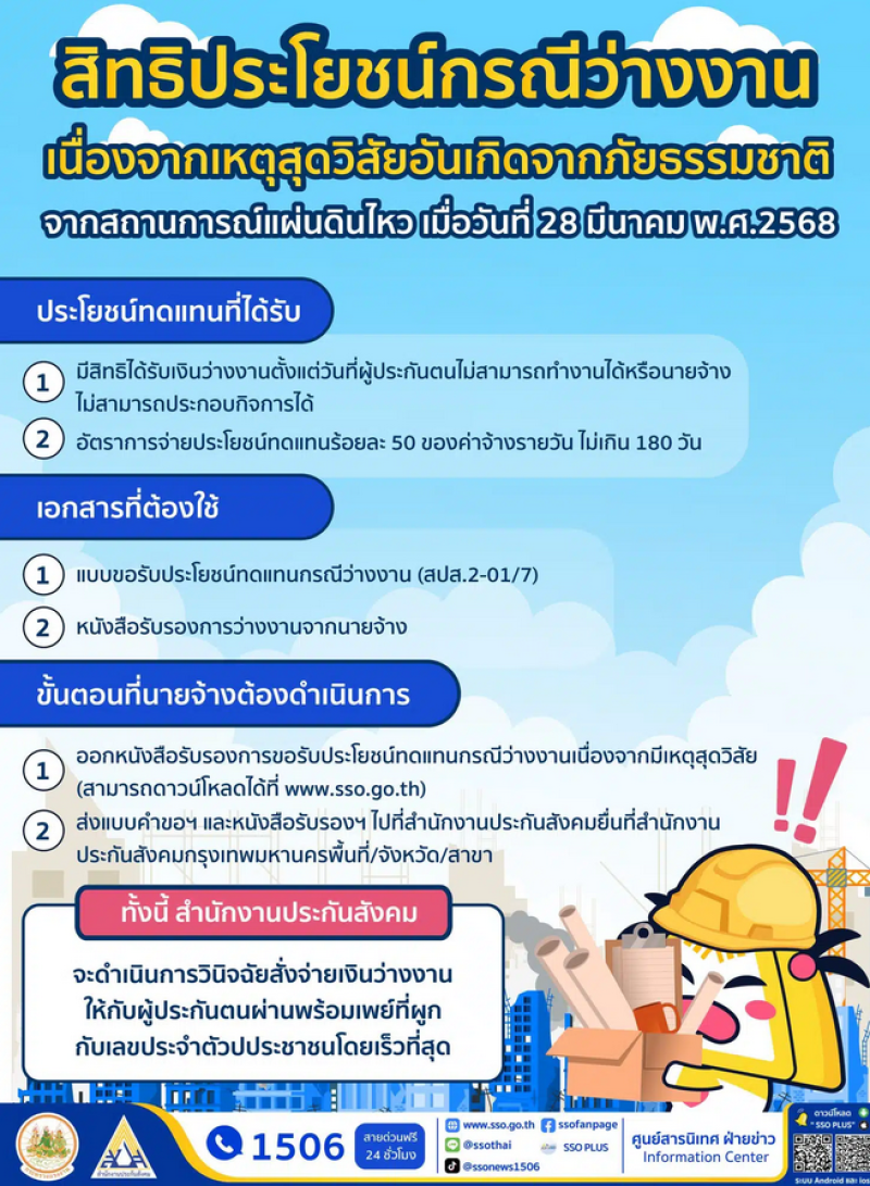 ประกันสังคม เปิดเงื่อนไข สิทธิประโยชน์ว่างงานจากภัยพิบัติธรรมชาติ แผ่นดินไหว (28 มี.ค. 68) ผู้ประกันตน ม.33 รับเงินทดแทน 50% ของค่าจ้างรายวัน นานสูงสุด 180 วัน