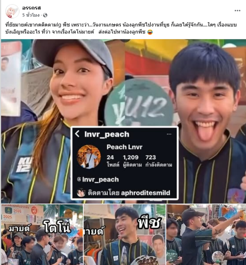ที่มายด์เขากดติดตามIg พีช เพราะว่า...วันงานเกษตร น้องลูกพีชไปงานที่บูธ ก็เลยได้รู้จักกัน....ใดๆ เรื่องแบบบังเอิญหรืออะไร ที่ว่า จากเรื่องโตโน่มายด์ ส่งต่อไปหาน้องลูกพีช