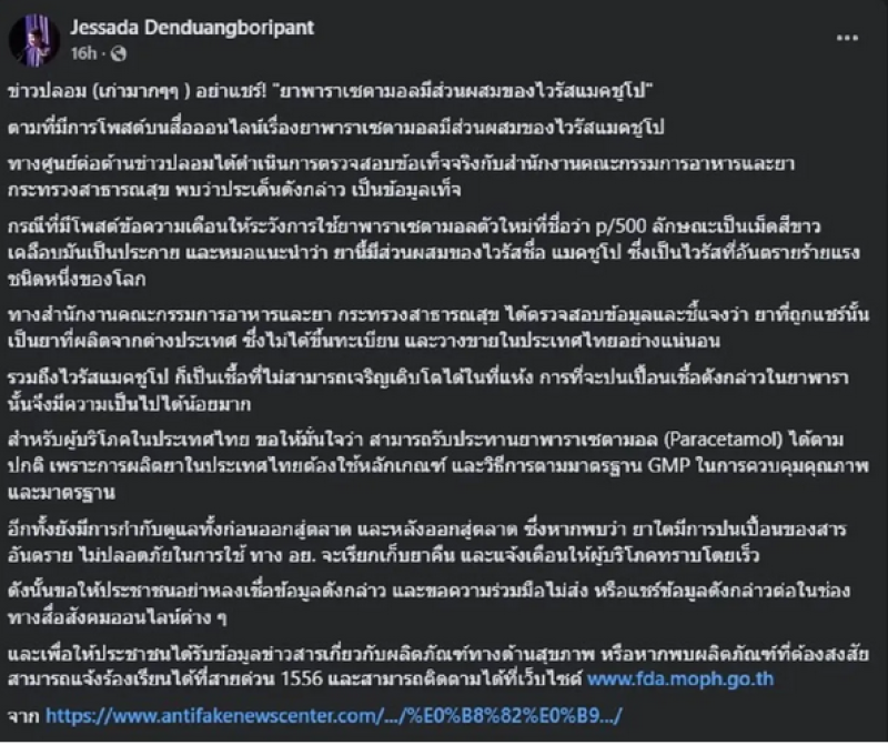 ตามที่มีการโพสต์บนสื่อออนไลน์เรื่องยาพาราเซตามอลมีส่วนผสมของไวรัสแมคชูโป