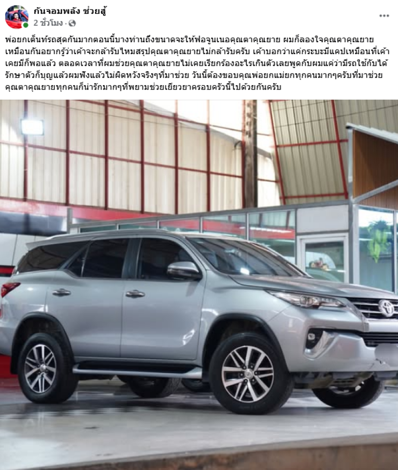 ล่าสุด กัน จอมพลัง ได้ออกมาโพสต์โดยระบุว่า พ่อยกเต็นท์รถสุดกันมากตอนนี้บางท่านถึงขนาดจะให้ฟอจูนเนอคุณตาคุณยาย ผมก็ลองใจคุณตาคุณยายเหมือนกันอยากรู้ว่าเค้าจะกล้ารับไหมสรุปคุณตาคุณยายไม่กล้ารับครับ เค้าบอกว่าแค่กระบะมีแคปเหมือนที่เค้าเคยมีก็พอแล้ว ตลอดเวลาที่ผมช่วยคุณตาคุณยายไม่เคยเรียกร้องอะไรเกินตัวเลยพูดกับผมแค่ว่ามีรถใช้กับได้รักษาตัวก็บุญแล้วผมฟังแล้วไม่ผิดหวังจริงๆที่มาช่วย วันนี้ต้องขอบคุณพ่อยกแม่ยกทุกคนมากๆครับที่มาช่วยคุณตาคุณยายทุกคนก็น่ารักมากๆที่พยามช่วยเยียวยาครอบครัวนี้ไปด้วยกันครับ