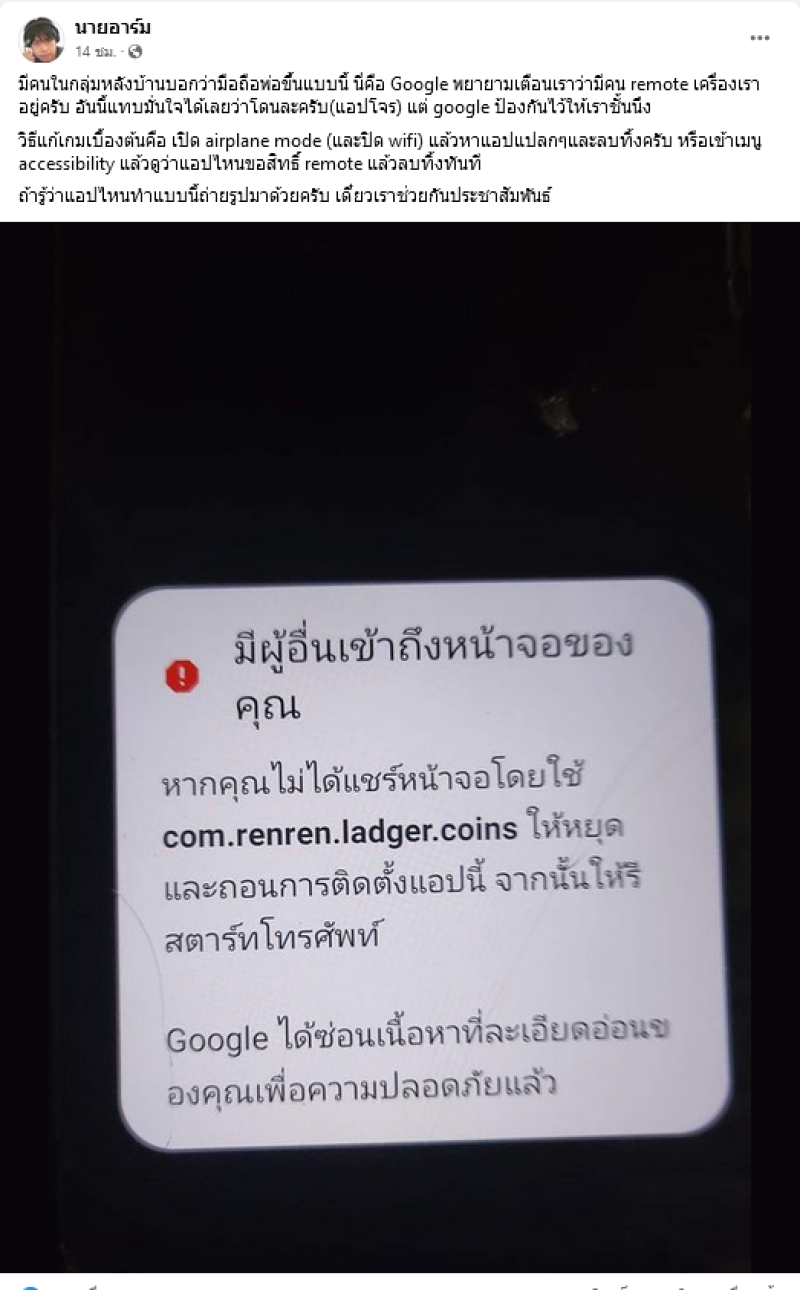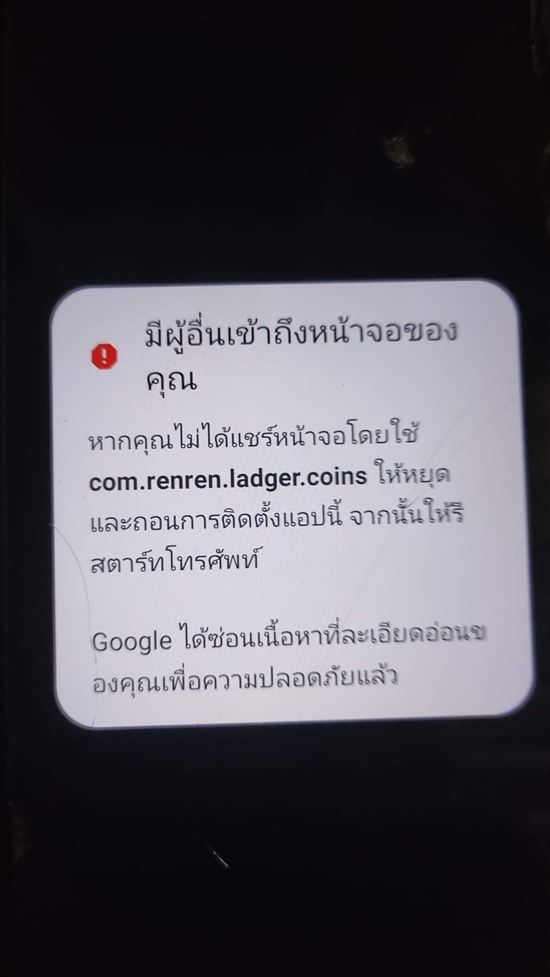 มีคนในกลุ่มหลังบ้านบอกว่ามือถือพ่อขึ้นแบบนี้ นี่คือ Google พยายามเตือนเราว่ามีคน remote เครื่องเราอยู่ครับ อันนี้แทบมั่นใจได้เลยว่าโดนละครับ (แอปโจร) แต่ google ป้องกันไว้ให้เราชั้นนึง