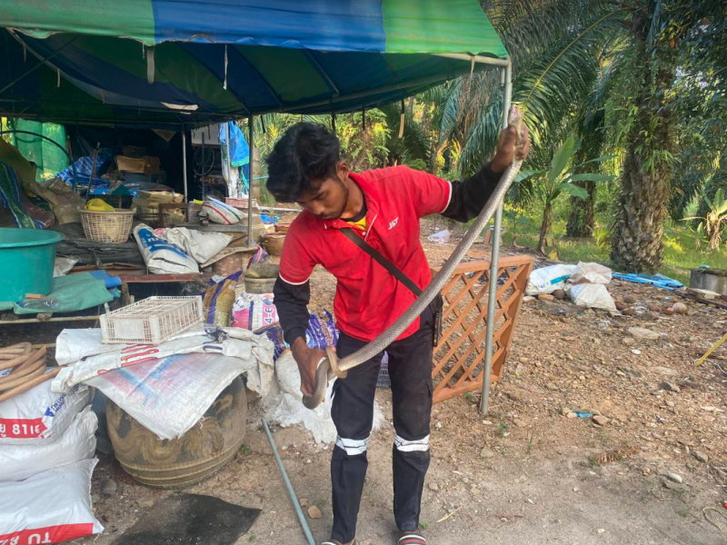 เมื่อถึงบ้านเกิดเหตุริมถนน พบนางจารึก อายุ 70 ปี ยืนรอหน้าบ้านด้วยอาการยังตกใจกลัว ก่อนแจ้งว่าในกระสอบปุ๋ยข้างบ้าน มีงูเห่าอยู่