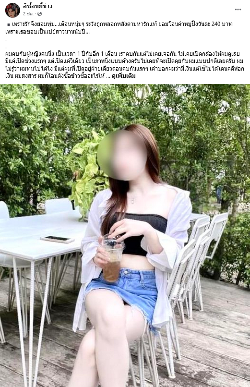 จากกรณี เพจ อีซ้อขยี้ข่าว ได้ออกมาโพสต์ภาพพร้อมระบุว่าผมคบกับผู้หญิงคนนึง เป็นเวลา 1 ปีกับอีก 1 เดือน เราคบกันแต่ไม่เคยเจอกัน ไม่เคยเปิดกล้องให้ผมดูเลย มีแค่เปิดช่วงแรก ๆ แต่เปิดแค่ “วิเดียว” เป็นภาพนิ่งแบบค้างครับ ไม่เคยที่จะเปิดคุยกับผมแบบปกติเลยครับ ผมไม่รู้ว่าผมทนไปได้ไง มีแต่ผมที่เปิดอยู่ฝ่ายเดียวตอนคบกันแรกๆ เค้าบอกผมว่า มีเงินแต่ใช้ไม่ได้ โดนคดีฟอกเงิน ผมสงสาร ผมก็โอนตังค์ซื้อข้าวซื้ออะไรให้ จนคบกันได้เดือนแรกเธอบอกผมว่ามีของแบรนด์เนม อยากปล่อยเช่าของ