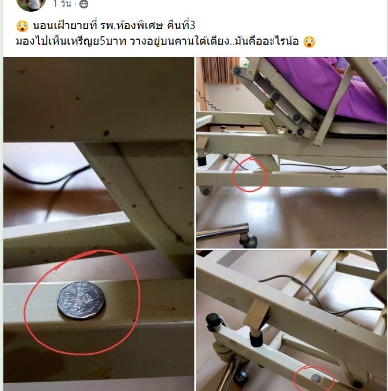 เรียกได้ว่าเป้นอีกหนึ่งเรื่องราวที่โลกออนไลน์เข้ามาแสดงความเห็นกันเป็นจำนวนมาก หลัง ผู้ใช้เฟซบุ๊กชื่อ เกียรติศักดิ์ บานตา ที่ได้ออกมาเผยภาพ และตั้งคำถามผ่านเฟซบุ๊กกลุ่มกลุ่มหนึ่ง หลังจากที่ไปนอนเฝ้าคุณยายในห้องพิเศษ และเจอเข้ากับเหรียญ 5 บาท ปริศนา วางอยู่ที่คานใต้เตียง โดยระบุว่า