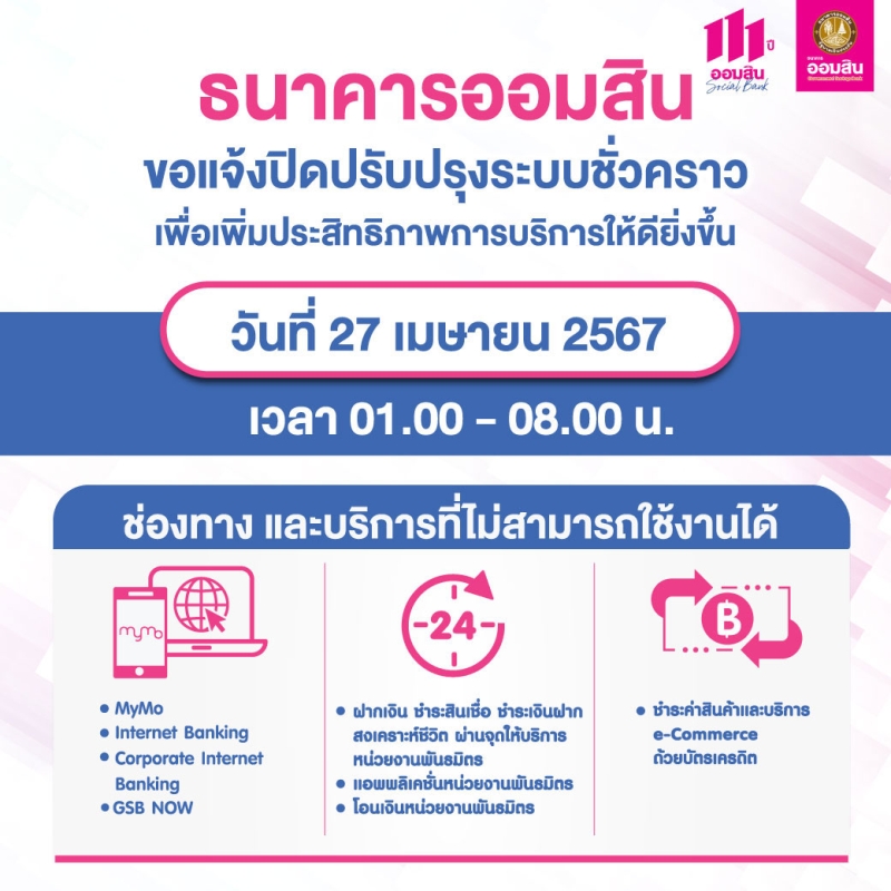 จากกรณี ธนาคารออมสิน ได้ออกมาประกาศโดยได้ระบุข้อความว่าธนาคารออมสิน ขอแจ้งปิดปรับปรุงระบบชั่วคราว เพื่อเพิ่มประสิทธิภาพการบริการให้ดียิ่งขึ้น ทำให้ลูกค้าไม่สามารถใช้บริการได้ในวันที่ 27 เมษายน 2567 เวลา 01.00 – 08.00 น.