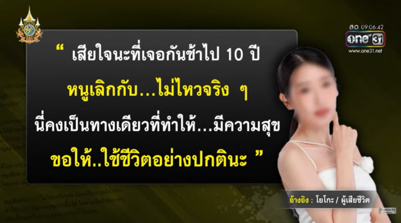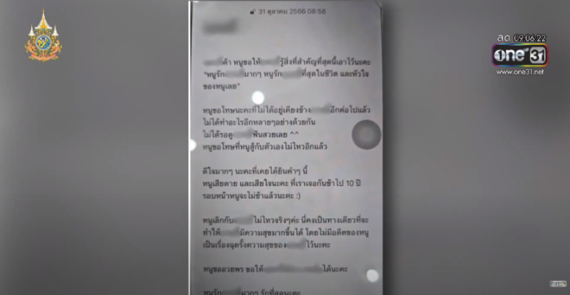 หนูเลิกกับ…ไม่ไหวจริง ๆ ค่ะ นี่คงเป็นทางเดียวที่จะทำให้…มีความสุขมากขึ้นได้ โดยไม่มีอดีตของหนูเป็นเรื่องฉุดรั้งความสุขของ…ไว้นะคะ หนูขออวยพร ขอให้ (ถูกเซ็นเซอร์) ได้นะคะ หนูรัก…มาก ๆ รักที่สุดนะคะ