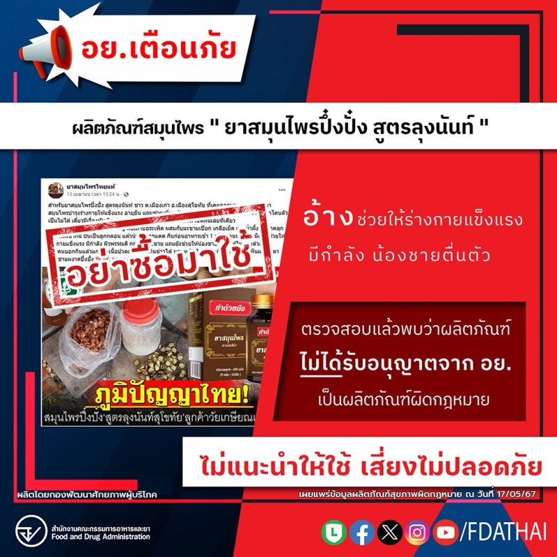 วันที่ 17 พฤษภาคม สำนักงานคณะกรรมการอาหารและยา (อย.) ได้โพสต์เฟซบุ๊ก แจ้งเตือน ผลิตภัณฑ์สมุนไพร ที่ช่วยให้ร่างกายแข็งแรงโดยระบุว่า อย.เตือนภัย ผลิตภัณฑ์สมุนไพร ยาสมุนไพรปึ๊งปั๋ง สูตรลุงนันท์ ยาสมุนไพรไทยแท้ อ้างช่วยให้ร่างกายแข็งแรงมีกำลัง อย.ตรวจสอบแล้วพบว่าเป็นผลิตภัณฑ์ที่ไม่ได้รับอนุญาตจาก อย.เสี่ยงอันตรายต่อประชาชน
