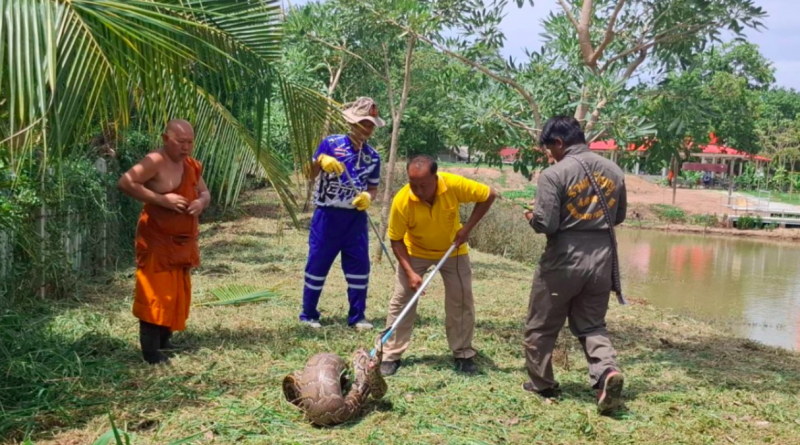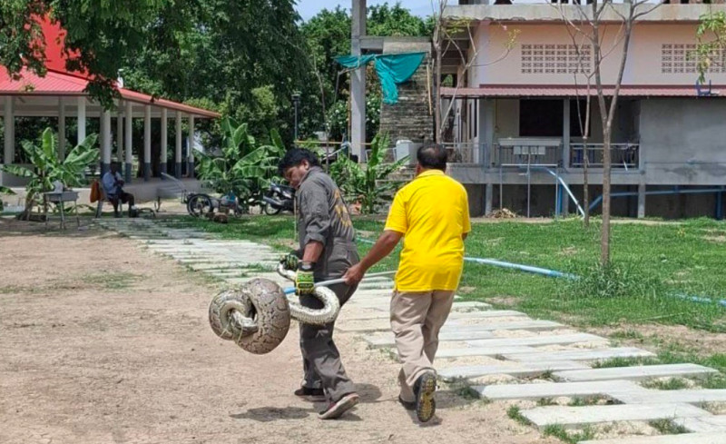 เมื่อวันที่ 29 พ.ค. 2567 ที่ผ่านมา วัดดอนโพธิ์ศรี ต.ห้วยกรดพัฒนา อ.สรรคบุรี จ.ชัยนาท อาสาสมัครมูลนิธิร่วมกตัญญูชัยนาท 3-4 นาย ช่วยกันจับงูเหลือมยักษ์ หลังพระลูกวัดตัดหญ้าภายในบริเวณวัด พบงูซ่อนตัวอยู่ในกอหญ้า ซึ่งมีลำตัวขนาดใหญ่มากและดูลักษณะท้องป่องเหมือนเพิ่งกินอะไรเข้าไปแล้วไม่สามารถเลื้อยหนีได้ จึงช่วยกันจับใส่กระสอบ แล้วนำไปปล่อยคืนธรรมชาติ ชาวบ้านเชื่อว่าเป็นงูเจ้าที่เพราะตัวใหญ่มาก
