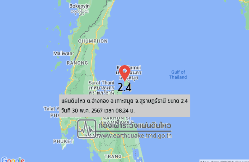 วันที่ 30 พฤษภาคม ผู้สื่อข่าวรายงานว่ากองเฝ้าระวังแผ่นดินไหว กรมอุตุนิยมวิทยา รายงานว่า เวลา 08.24 น. (ตามเวลาประเทศไทย) เกิดแผ่นดินไหว ขนาด 2.4 บริเวณศูนย์กลาง ต.อ่างทอง อ.เกาะสมุย จ.สุราษฎร์ธานี ความลึก 4 กิโลเมตร รู้สึกได้ถึงแรงสั่นสะเทือน