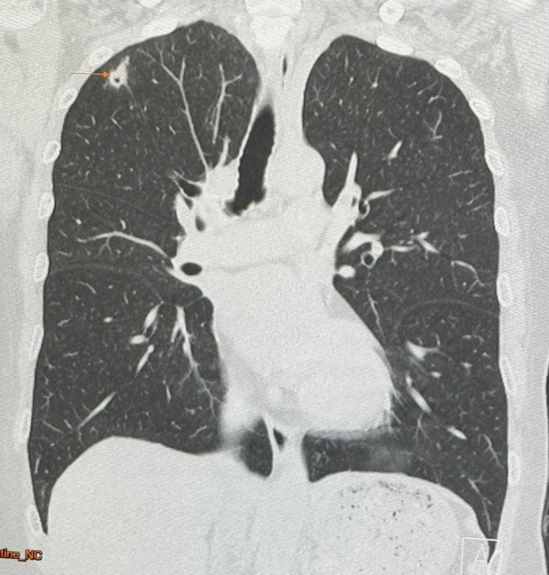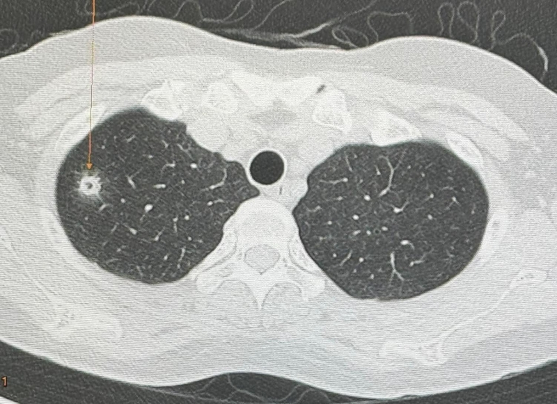 นพ.มนูญ ลีเชวงวงศ์ แพทย์เฉพาะทางด้านโรคระบบการหายใจ รพ.วิชัยยุทธ โพสต์ ผู้ป่วยหญิงอายุ 52 ปี บ้านอยู่ กทม. ปกติแข็งแรงดี ไม่ไอ ไม่มีไข้ ไม่เบื่ออาหาร น้ำหนักไม่ลด ไม่ปวดหัว ไม่เคยสูบบุหรี่ ไม่มีโรคประจำตัว ไปตรวจร่างกายประจำปี วันที่ 12 พฤษภาคม 2567 เอกซเรย์ปอด พบก้อนเล็กๆ เกิดขึ้นใหม่ที่ปอดขวากลีบบน (ดูรูป) เอกซเรย์ปอดก่อนหน้านั้น 1 ปีปกติ ทำคอมพิวเตอร์ปอดพบก้อนขนาด 0.9 × 0.9 × 1.7 เซนติเมตร เห็นโพรงอยู่ข้างในก้อนที่ปอดขวากลีบบน (ดูรูป) ตรวจเลือดไม่ติดเชื้อเอชไอวี