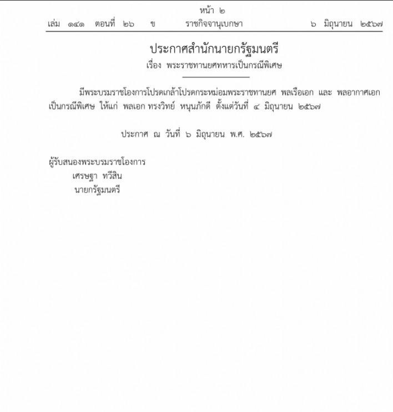 วันที่ 6 มิถุนายน 2567 เว็บไซต์ราชกิจจานุเบกษา ได้เผยแพร่ประกาศสํานักนายกรัฐมนตรีเรื่อง พระราชทานยศทหารเป็นกรณีพิเศษ