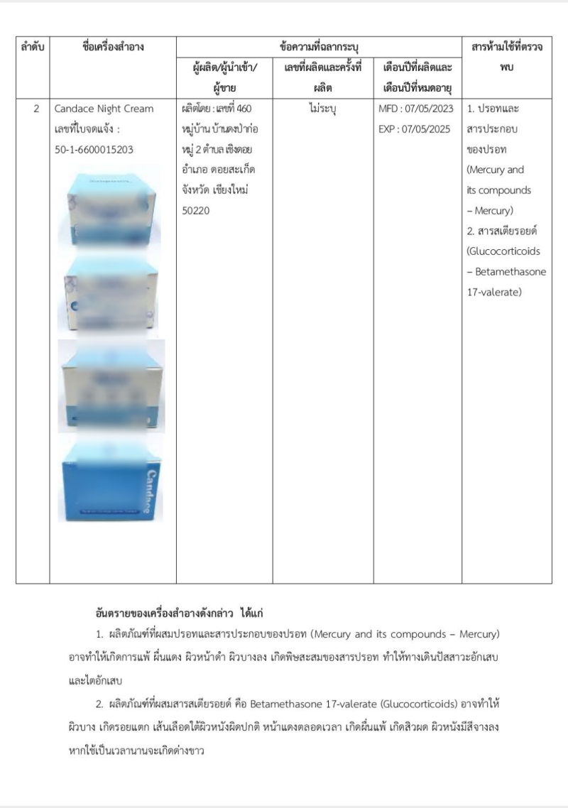 จากกรณี สำนักงานคณะกรรมอาหารและยา ได้ออกมาโพสต์เตือนโดยระบุว่า สำนักงานคณะกรรมการอาหารและยา ได้ตรวจสอบและสั่งซื้อตัวอย่างเครื่องสำอางจากร้านค้าออนไลน์ (1)“B&P BeautyShop” ทำง TikTok และ (2) บัญชีเฟซบุ๊ก “ไอ่ มิ้นนี่” ผลการตรวจสอบพบสารที่ห้ามใช้ เป็นส่วนผสมในการผลิตเครื่องสำอาง จึงขอประกาศผลการตรวจสอบหรือผลวิเคราะห์เครื่องสำอาง ให้ประชาชนทราบ ดังนี้ ลำดับ ชื่อเครื่องสำอาง ข้อความที่ฉลากระบุ สารห้ามใช้ที่ตรวจ
