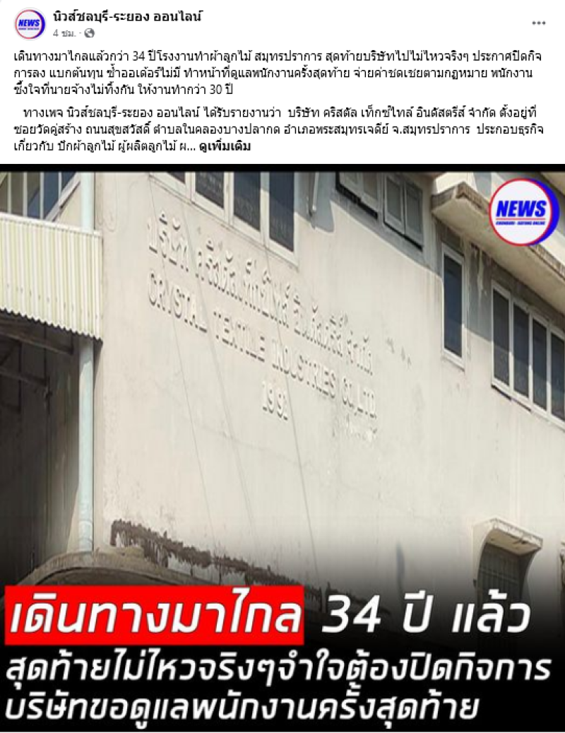 นอกจากนี้ทางเพจนิวส์ชลบุรี-ระยอง ออนไลน์ ยังได้ระบุเพิ่มเติมอีกว่า เดินทางมาไกลแล้วกว่า 34 ปีโรงงานทำผ้าลูกไม้ สมุทรปราการ สุดท้ายบริษัทไปไม่ไหวจริงๆ ประกาศปิดกิจการลง แบกต้นทุน ซ้ำออเดอร์ไม่มี ทำหน้าที่ดูแลพนักงานครั้งสุดท้าย จ่ายค่าชดเชยตามกฎหมาย พนักงานซึ้งใจที่นายจ้างไม่ทิ้งกัน ให้งานทำกว่า 30 ปี