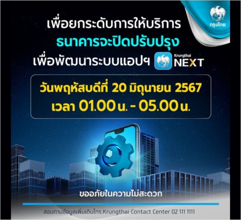 จากกรณี ธนาคารกรุงไทย ประกาศผ่านเพจเฟซบุ๊ก “Krungthai Care” ระบุว่า เพื่อยกระดับการให้บริการ ธนาคารจะปิดปรับปรุงเพื่อพัฒนาระบบแอปพลิเคชั่น “Krungthai NEXT” ในวันพฤหัสบดีที่ 20 มิถุนายน 2567 เวลา 01.00-05.00 น.