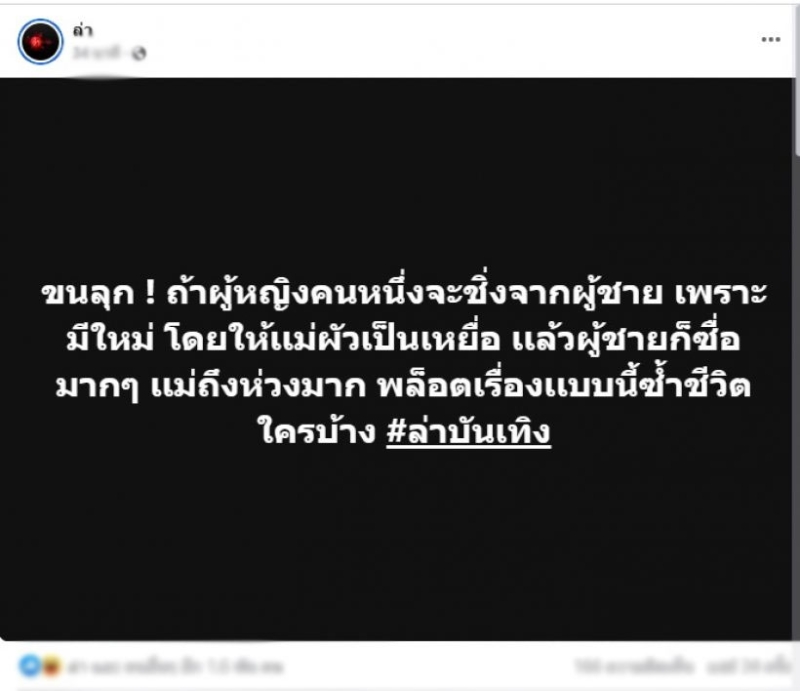จากกรณีเพจดัง ล่าก็มาเปิดปมใหม่โดยได้โพสต์ระบุว่า ขนลุก ถ้าผู้หญิงคนหนึ่งจะชิ่งจากผู้ชาย เพราะมีใหม่ โดยให้เเม่ผัวเป็นเหยื่อ เเล้วผู้ชายก็ซื่อมากๆ เเม่ถึงห่วงมาก พล็อตเรื่องเเบบนี้ซ้ำชีวิตใครบ้าง #ล่าบันเทิง