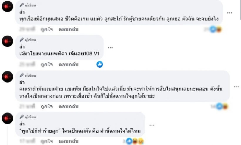 ทุกเรื่องมีอีกมุมเสมอ ชีวิตคือเกม เเม่ผัว ลูกสะใภ้ รักผู้ชายคนเดียวกัน ลูกเธอ ผัวฉัน จะจบยังไง คนเราถ้ามันเเบ่งฝ่าย เเบ่งทีม มีธงในใจไปเเล้วเนี่ย มันจะทำให้การสืบไม่สนุกเลยนะหล่อน ดังนั้น วางใจเป็นกลางก่อน เพราะเมื่อเช้า ฉันก็ไปนั่งเเทนใจลูกใภ้มาย่ะ "พูดไปก็ทำร้ายลูก" ใครเป็นเเม่ผัว คือ คำนี้เเทนใจได้ไหม"