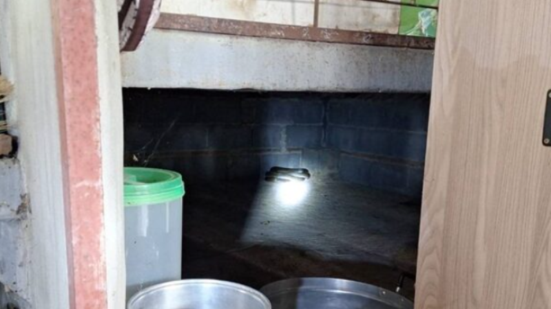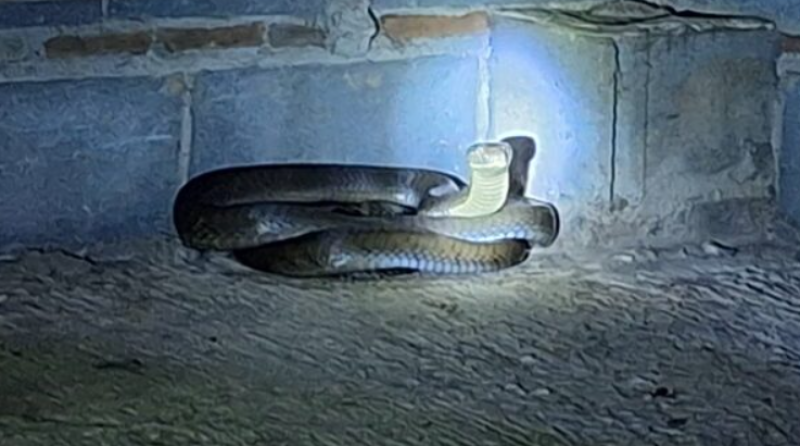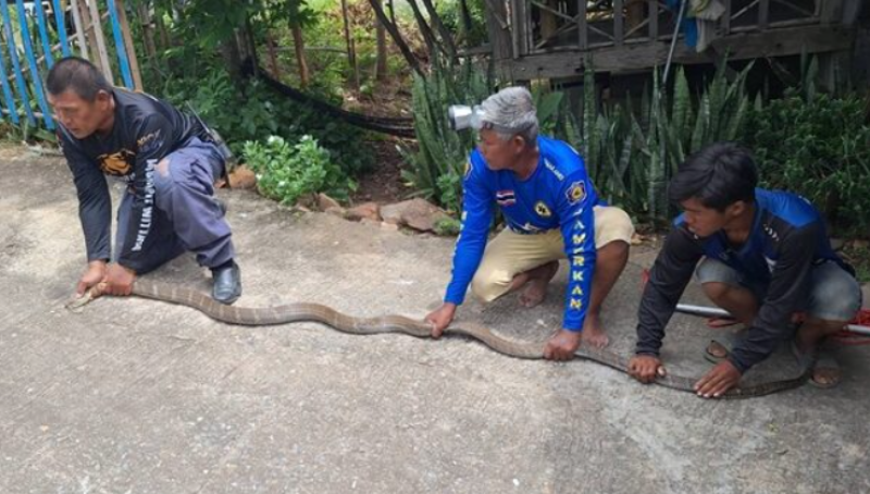 เมื่อเจ้าหน้าที่กู้ภัยไปถึง เป็นบ้านชั้นเดียวแต่ยกพื้นสูงขึ้นมา ใต้ถุนบ้านพบงูจงอางขนาดใหญ่นอนขดตัวอยู่ เจ้าหน้าที่จึงนำอุปกรณ์จับสัตว์เลื้อยคลานมาจับไว้ได้ ใช้เวลาประมาณ 10 นาที วัดความยาวได้ 3.20 เมตร น้ำหนัก 4.5 กิโลกรัม จึงรีบนำไปปล่อยคืนสู่ธรรมชาติ