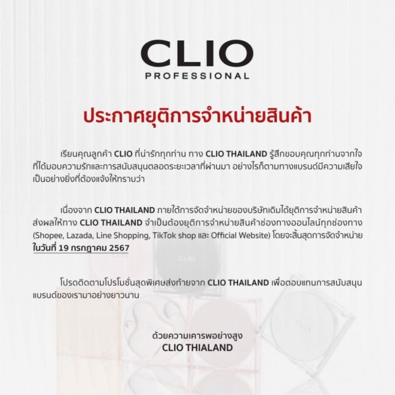 เนื่องจาก CLIO THAILAND ภายใต้การจัดจำหน่ายของบริษัทเดิมได้ยุติการจำหน่ายสินค้า ส่งผลให้ทาง CLIO THAILAND จำเป็นต้องยุติการจัดจำหน่ายสินค้าช่องงทางออนไลน์ทุกช่องทาง (Shopee, Lazada, Line Shopping, TikTok Shop และ Official Website) โดยจะสิ้นสุดการจัดจำหน่ายในวันที่ 19 กรกฎาคม 2567