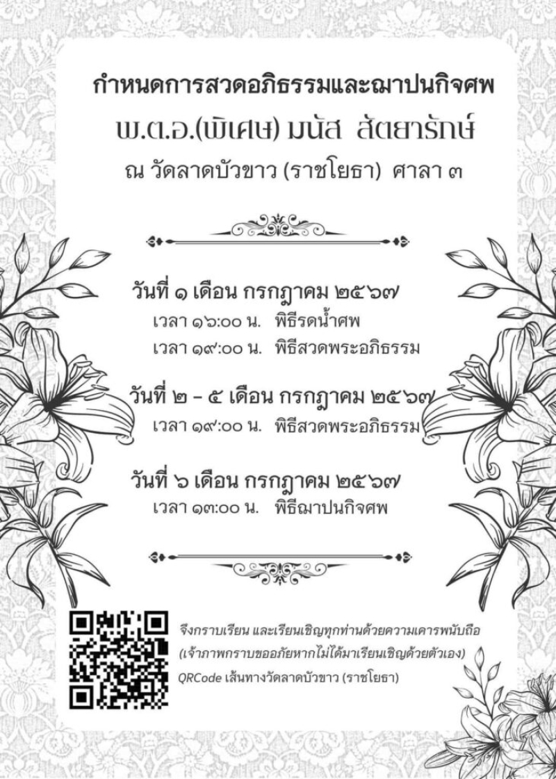 พ.ต.อ.มนัส สัตยารักษ์ อดีตนายตำรวจและนักเขียนอาวุโส ถึงแก่กรรมแล้ว เมื่อวันที่ 1 กรกฏาคม ที่ผ่านมา มีการสวดอภิธรรม ที่วัดลาดบัวขาว (ราชโยธา) ตั้งแต่วันที่ 1-5 กรกฏาคม และ จะมีพิธีฌาปนกิจ ในวันที่ 6 กรกฏาคม เวลา 13.00 น.