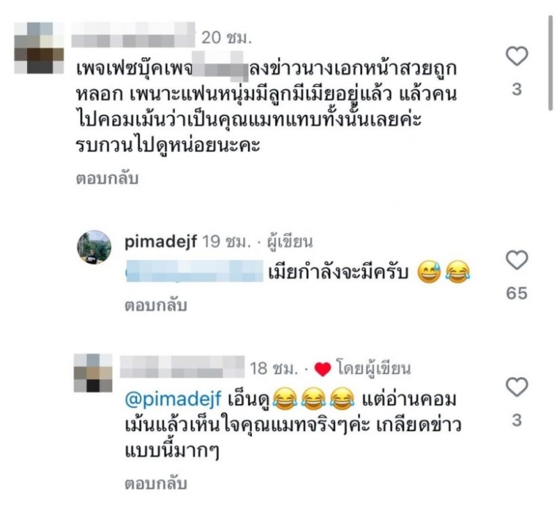 ล่าสุดก็มีชาวเน็ตเข้ามาคอมเมนต์ในใต้โพสต์อินสตาแกรมของหนุ่มเฟมว่า เพจเฟซบุ๊คเพจลงข่าวนางเอกหน้าสวยถูกหลอก เพราะแฟนหนุ่มมีลูกมีเมียอยู่แล้ว แล้วคนไปคอมเม้นว่าเป็นคุณแมทแทบทั้งนั้นเลยค่ะ รบกวนไปดูหน่อยนะคะ ด้าน เฟม เข้ามาตอบกลับทันทีว่า เมียกำลังจะมีครับ
