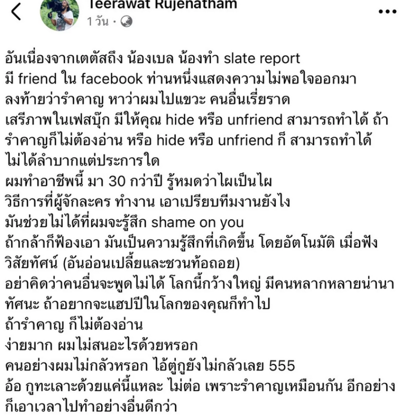 เมื่อกี้เพิ่งดูสกู๊ปไทยพีบีเอสที่ไปสัมภาษณ์ บรรดาผู้คนในวงการละคร ที่กำลังถูก Disrupt อยู่ตอนนี้ ทุกคนเห็นด้วยที่จะต้องปรับตัว ต่างๆ บลาๆๆๆ ผมเห็นหน้าของพวกเขา นึกย้อนเห็นการเอากำไรเกินควรโดยการบีบงบทำให้ต้องวางตารางทำงานที่ใช้คนอย่างโหดร้าย คุณไม่ได้คิดอะไรที่พรีเมียมหรอก ถ้าคิดถึงคุณภาพมันจะไม่มีว่าต้องถ่ายวันละ 20 ฉาก ไอ้X ผมมองหน้าพวกมัน Shame โคตรน่าละอาย