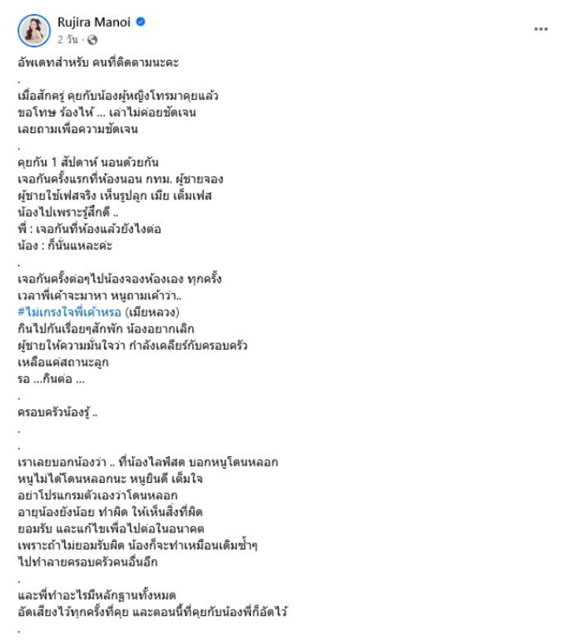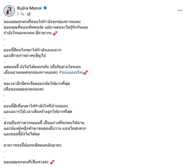 และได้โพสต์เพิ่มเติมว่า อัพเดทสำหรับ คนที่ติดตามนะคะ เมื่อสักครู่ คุยกับน้องผู้หญิงโทรมาคุยแล้ว ขอโทษ ร้องไห้ เล่าไม่ค่อยชัดเจน เลยถามเพื่อความชัดเจน