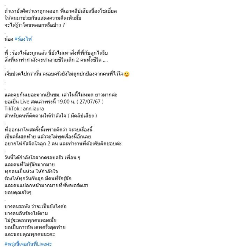 ที่ออกมาโพสครั้งนี้เพราะคิดว่า จะจบเรื่องนี้ เป็นครั้งสุดท้าย แล้วจะไม่พูดเรื่องนี้อีกเลย อยากโฟกัสจิตใจลูก 2 คน และทำงานที่ต้องรับผิดชอบค่ะ